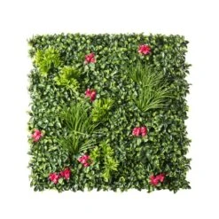 Faites respirer tous les espaces sans effort grâce à nos murs végétaux artificiels imitation naturelle ! chic et champêtre, le mur végétal est une solution d’occultation ou d’ornement jouant la carte du naturel. Ce produit est aussi bien adapté aux jardins, terrasses et balcons. Il est facile à poser sur des panneaux rigides de clôture ou sur des murs et ne nécessite aucun entretien. Conçus par carré de 1 mètre, les murs végétaux peuvent se clipser entre eux à l’infini : laissez votre créativité s’exprimer ! grande qualité de fabrication et résistance aux uv et à l’eau. garantie : 5 ans. cinq modèles pour répondre à tous les styles : le modèle amazone : foisonnant, dense et luxuriant avec des fleurs fuchsia la version fougère : très verte et proche des plantes que l’on trouve en europe la version liseron : champêtre et composée de trèfles, de petites feuilles et de fleurs blanches esprit « campagne » le modèle lierre : classique et imitant différents types de lierre pour un effet « plante grimpante » le modèle tropical : ambiance jungle tropicale avec des herbes hautes, des feuillages, et quelques fleurs rouge vif monté sur support plastique, sans métaux lourds et non toxique. attaches vendues séparément.