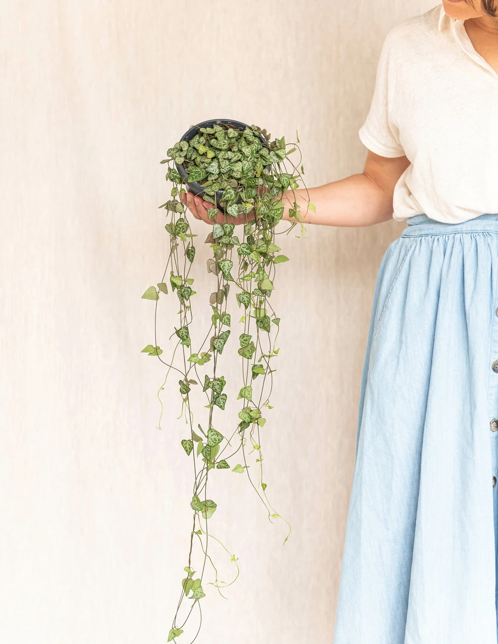 Le ceropegia est surnommé la chaîne de coeur à cause de la forme de ses petites feuilles gorgées d’eau.c’est une magnifique plante tombante qui est facile à bouturer et à entretenir : 2 arrosages par mois seulement !